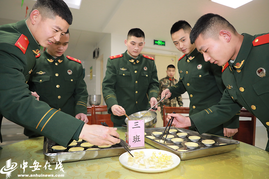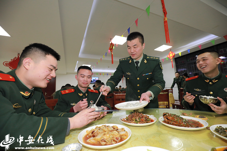 武警安徽省總隊合肥支隊十九中隊中隊長葛宏給新戰士夾湯圓。