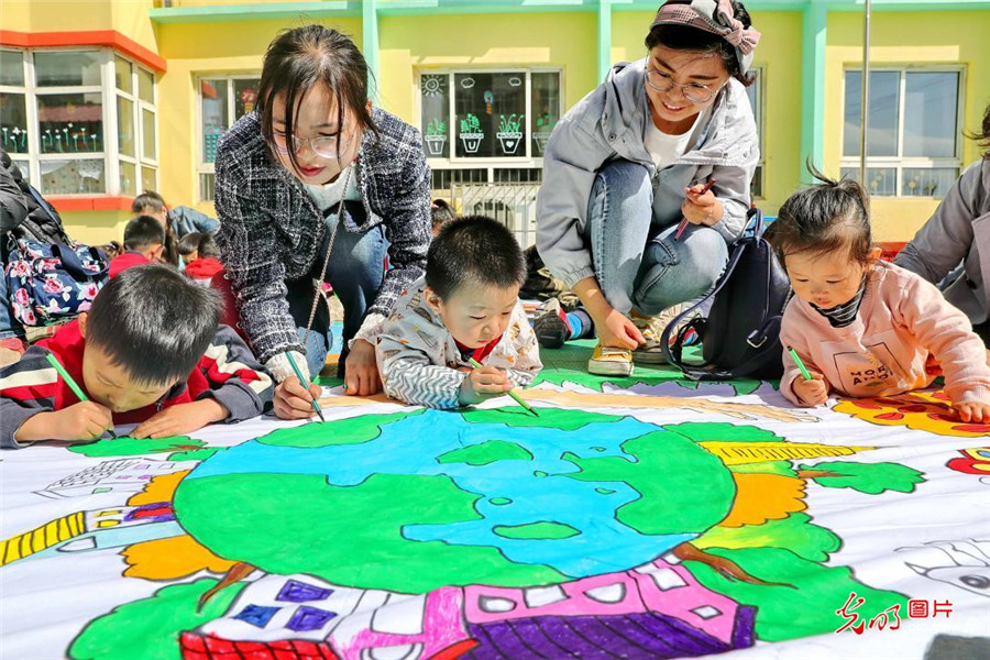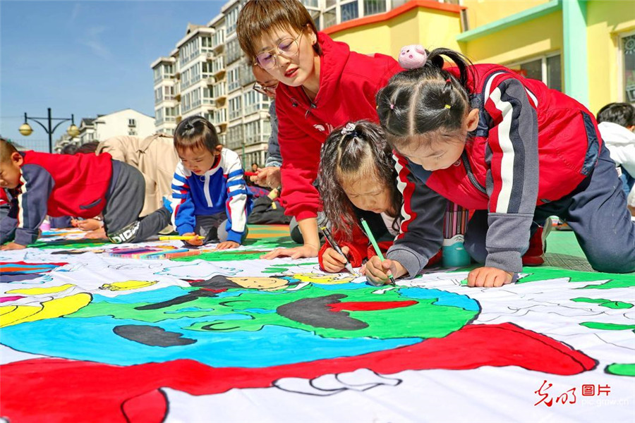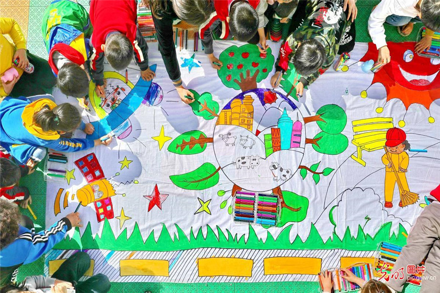 2019年4月18日,河北省秦皇島市海港區社區居民和小朋友共同彩繪長卷。此次活動由社區居民帶領轄區幼兒園小朋友用五彩畫筆在百米白色畫卷上畫出自己眼中的美麗地球,增強未成年人保護生態環境和愛護地球的意識。(