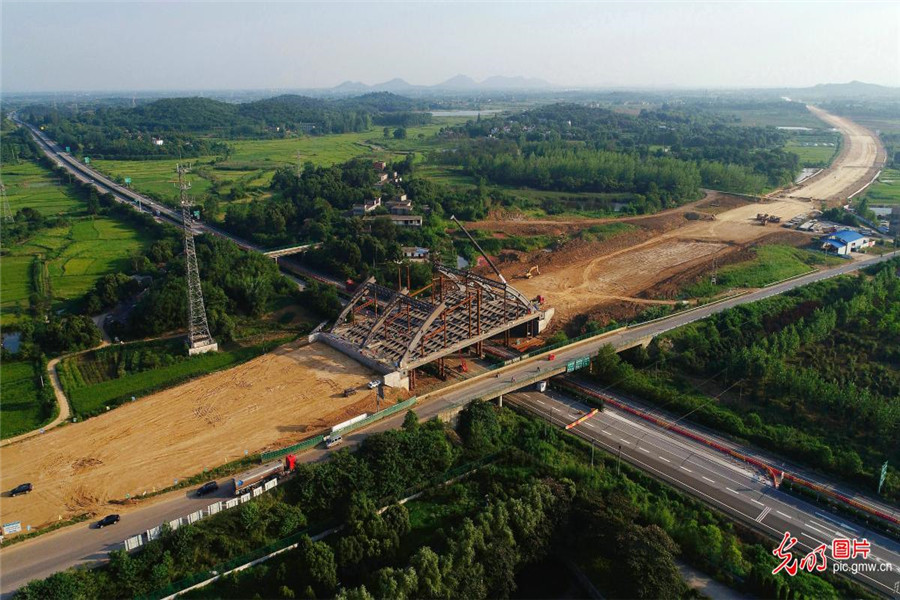 2019年7月2日,施工人員正在安徽省合肥市廬江縣境內的巢廬公路(廬城至桐城段)上跨G3京臺高速橋進行鋼結構安裝作業。巢廬公路改建工程,起于G3京臺高速廬江南出口與廬江外環南路交叉口,終至廬江縣與桐城市交界處,全長20.3公里,是合肥南部副中心一條一級公路。(王閩攝/光明圖片)