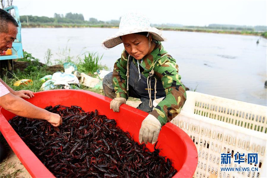 7月17日,明光市明西街道后薛村村民在分揀稻田養殖的小龍蝦。 近年來,安徽省明光市大力發展“稻蝦共作”立體生態循環農業,通過“龍頭企業+合作社”的形式,帶動當地農民在稻田里進行水稻和小龍蝦立體種養殖,助力農民增產增收。 新華社記者 劉軍喜 攝