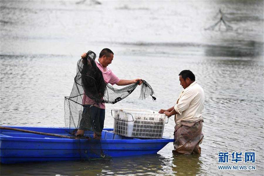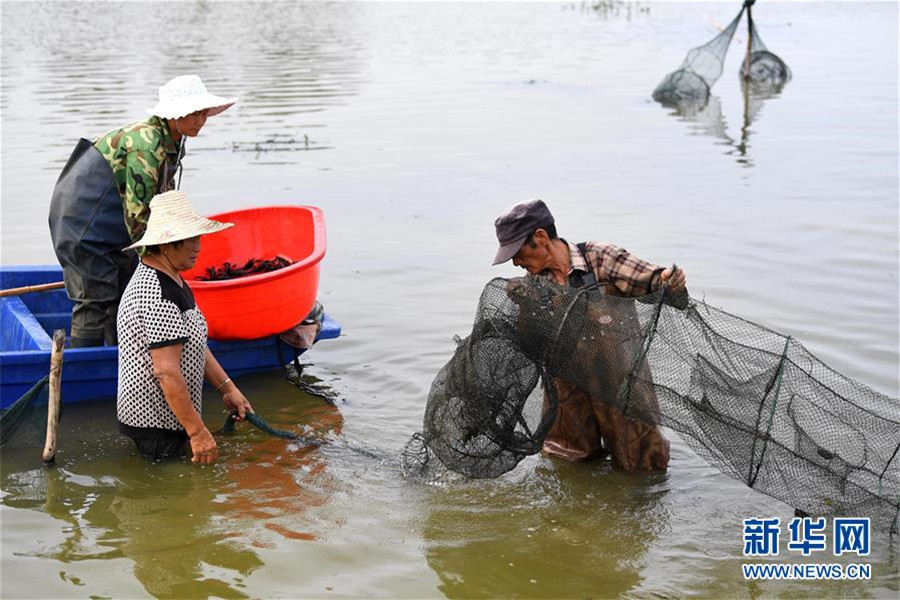 7月17日,明光市明西街道后薛村村民在打撈稻田里養殖的小龍蝦。 近年來,安徽省明光市大力發展“稻蝦共作”立體生態循環農業,通過“龍頭企業+合作社”的形式,帶動當地農民在稻田里進行水稻和小龍蝦立體種養殖,助力農民增產增收。 新華社記者 劉軍喜 攝