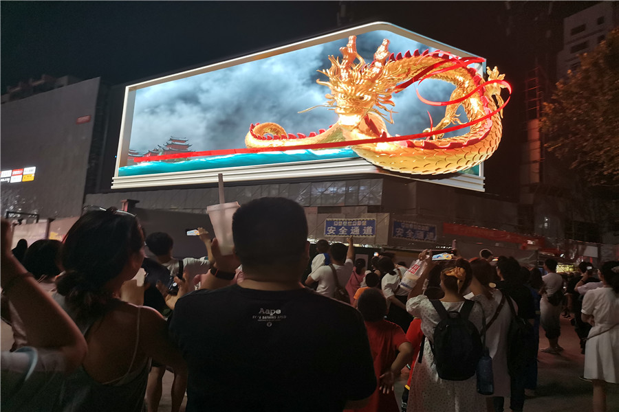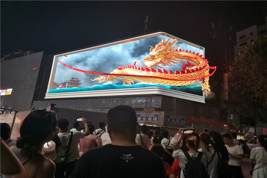 逼真的宇宙飛船、巨龍充滿未來科技感,似乎要沖出大屏幕,現(xiàn)場觀賞的市民紛紛驚嘆。裸眼3D大屏由540塊單體屏幕組合而成,面積達490平方米,屏幕呈L形,轉(zhuǎn)角平滑,可呈現(xiàn)無縫銜接的空間裸眼3D感。