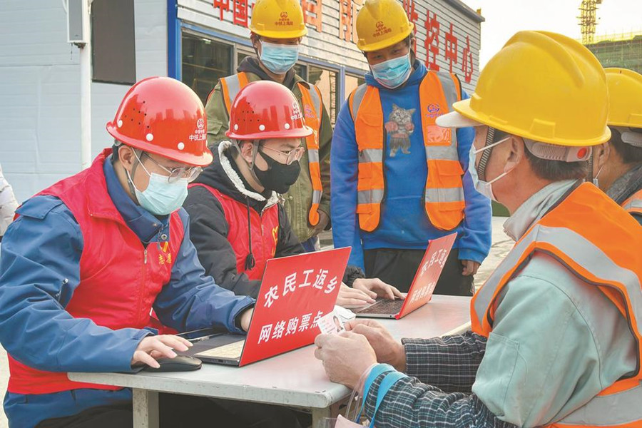 1月7日,中鐵上海局三公司創智天地項目部組織青年志愿者在工地設立農民工購票服務點,幫助不會上網的農民工兄弟購買返鄉車票,溫暖民工回家路。記者 李博 通訊員 龔邵李 攝