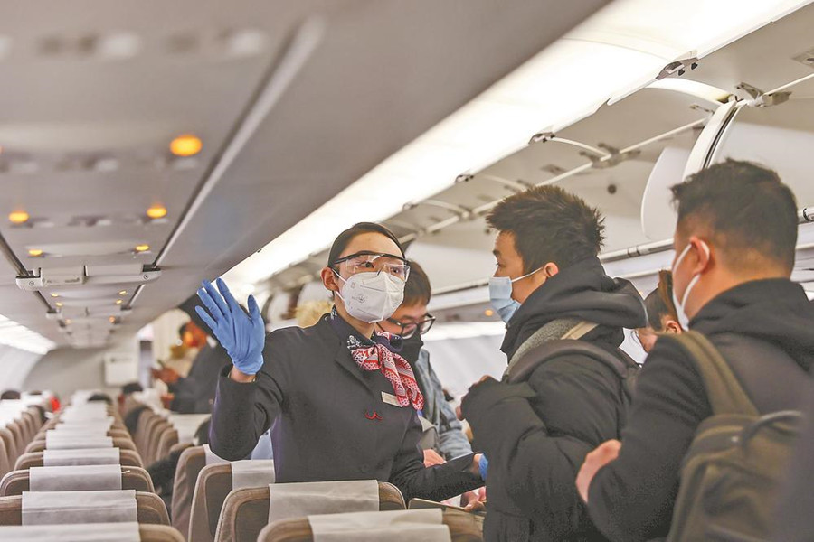 1月7日,合肥新橋國際機場,東航執飛的合肥—西安MU2385航班上,乘務員在服務旅客。據悉,春運期間,合肥新橋機場計劃執飛航班約9750架次,旅客吞吐量約95.8萬人次。記者 范柏文 攝