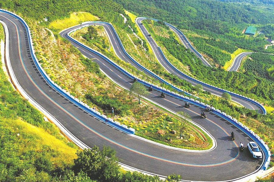 9月9日,廬江縣礬山鎮雙頂山六道拐路段,摩托車隊在體驗群山彎道騎行的樂趣。近年來,廬江縣著力謀劃廬東南地區鄉村旅游,按照我省旅游風景道標準建設120公里線路, 沿線“九曲十八景”的綺麗風光吸引了眾多游客。