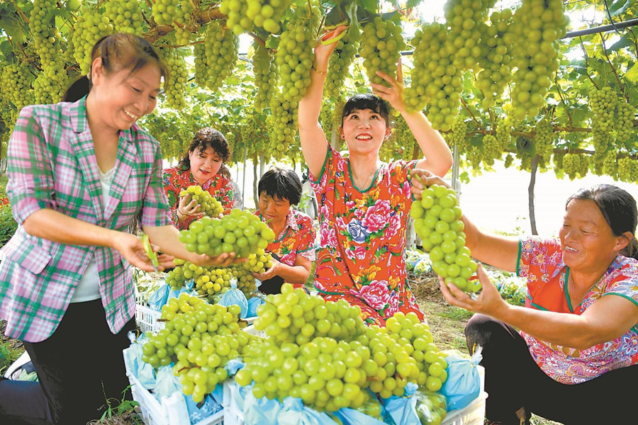 9月10日,在亳州市譙城區(qū)趙橋鄉(xiāng)雙樓村“徽姑娘”家庭農(nóng)場,果農(nóng)在采收葡萄以供應市場。近年來,亳州市大力發(fā)展生態(tài)休閑農(nóng)業(yè),幫助農(nóng)民在家門口實現(xiàn)就業(yè)增收。