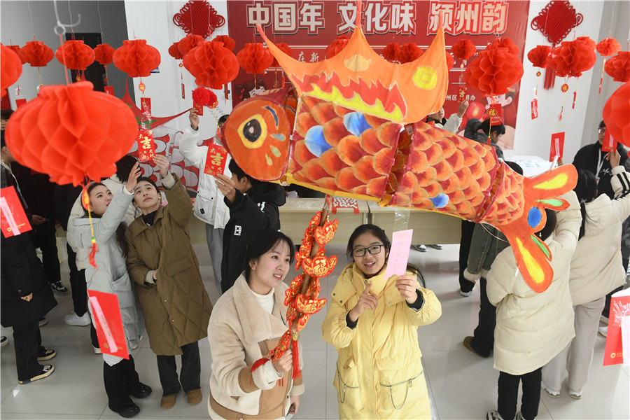 2月24日,阜陽市潁州區新時代文明實踐中心大廳,市民在猜燈謎、慶元宵。通訊員 王 彪 攝
