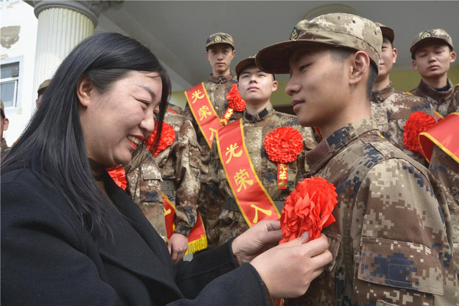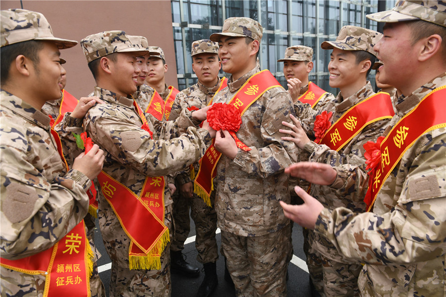 3月17日,入伍新兵參加阜陽(yáng)市潁州區(qū)新兵入伍歡送活動(dòng)。阜陽(yáng)市1000余名新兵于18日啟運(yùn),陸續(xù)奔赴全國(guó)各地軍營(yíng)。特約攝影 王 彪 攝