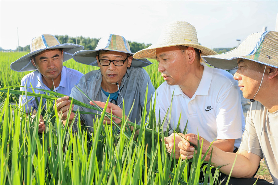 7月21日,安徽農業大學水稻專家吳文革(右二)來到合肥市肥東縣石塘鎮省級農業科技示范基地,在田間地頭“把脈問診”水稻產量形成關鍵期的田管,指導種糧大戶防范澇旱急轉,科學應對高溫天氣;精準施用穗肥和做好穗期病蟲害預防,助力水稻增產豐收。