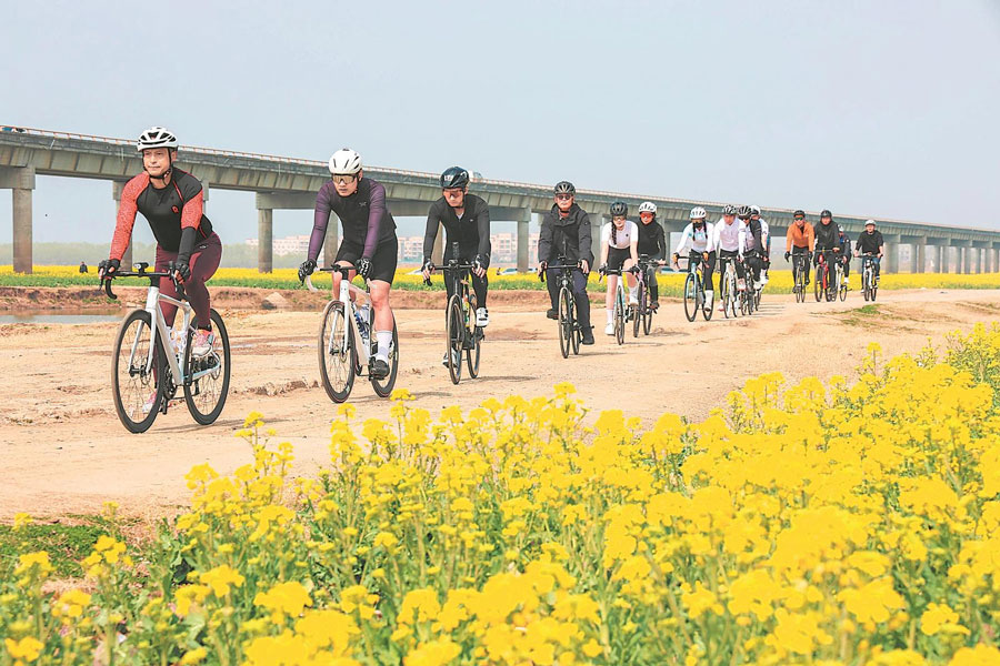 3月8日,阜陽市潁州區數十名騎行愛好者,騎行穿梭在阜南四里湖油菜花海,感受運動快樂,享受美好春光。 通訊員 張天峰 攝