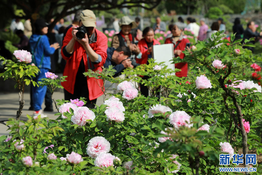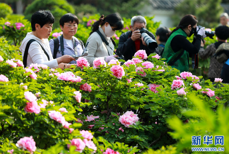 4月8日,游客在安徽省淮北市相山公園牡丹園游覽拍照。新華網發(萬善朝 攝)