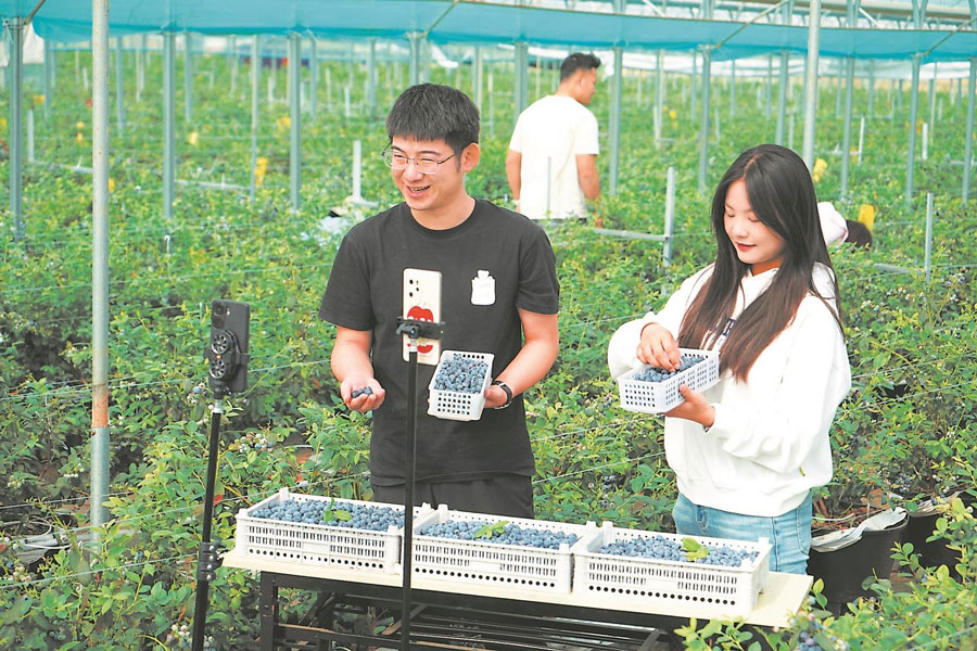5月7日,在安慶市懷寧縣金拱鎮高湖村藍莓種植基地,鎮村干部正在地頭為果農直播帶貨,通過現場采摘、品嘗,助力農產品銷售。通訊員 檀志揚 丁浩浩 攝