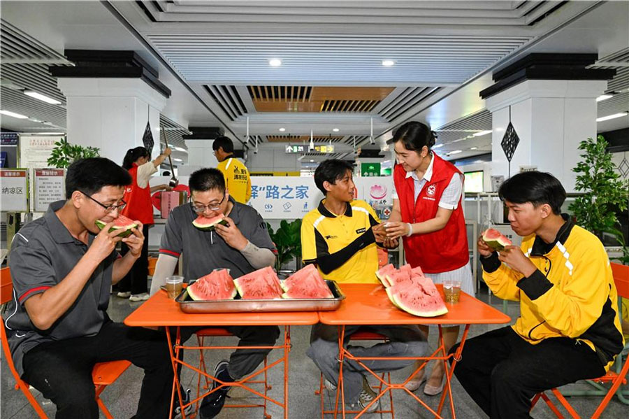 7月2日,在合肥市廬陽區(qū)海棠街道轄區(qū)內(nèi)海棠地鐵站,快遞、外賣配送員在“驛站”納涼休息。該“驛站”為新就業(yè)群體、戶外勞動者免費提供充電、飲水等服務(wù)。本報通訊員 趙明 攝