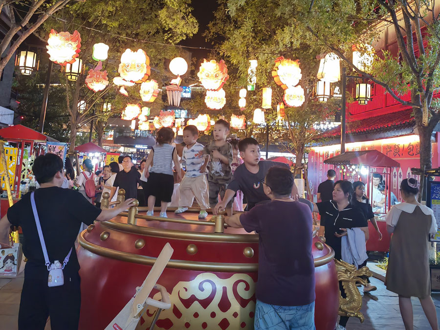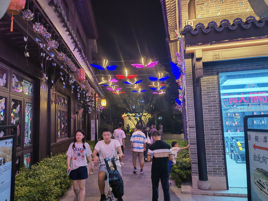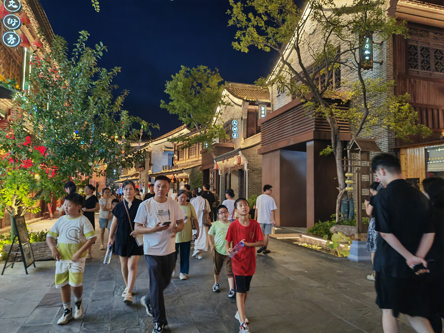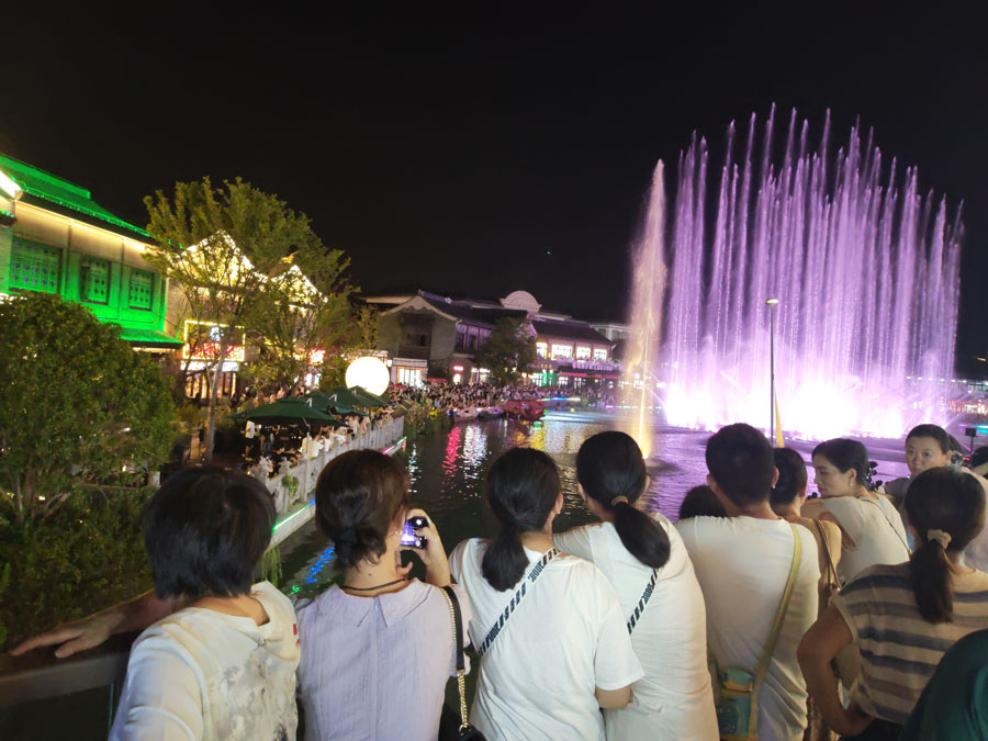 8月23日傍晚,華燈初上,霓虹閃爍,古色古香的塘溪津門水街游人如織。以宋式文化為底蘊的津門水街,不僅匯集各色美食,還有各類國風文創小鋪。夜幕降臨,美輪美奐的水光交融表演更是吸引大量游客來此打卡消費?!耙菇洕辈粌H點亮了城市的夜色,也在不斷激發消費新活力。(賀鵬云)