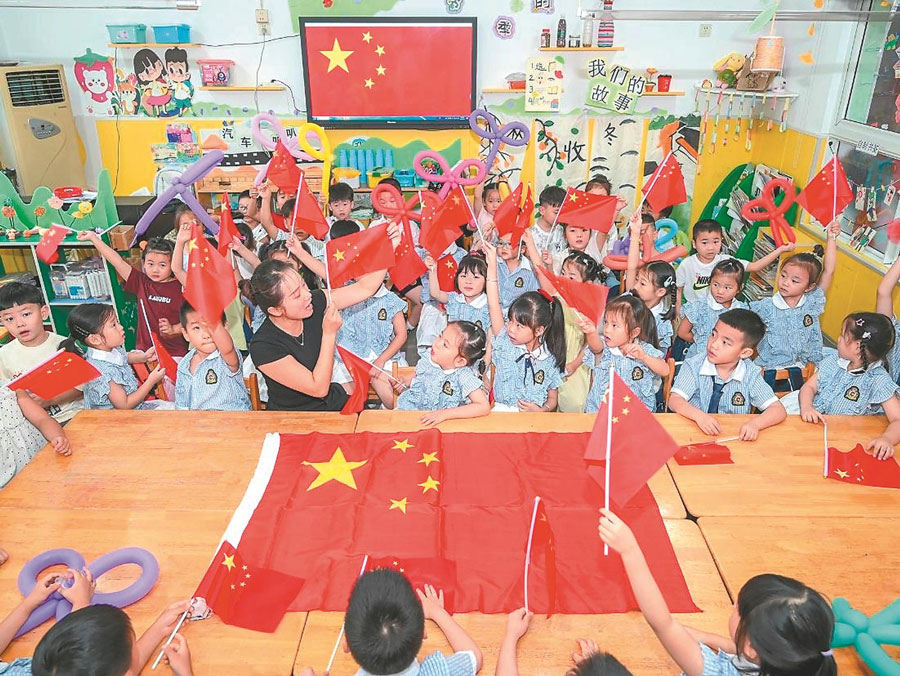 9月1日,在馬鞍山市和縣培賢幼兒園,老師在給孩子們講解國旗的故事,并教唱國歌,讓愛國主義精神代代相傳。 通訊員 秦祖泉 攝