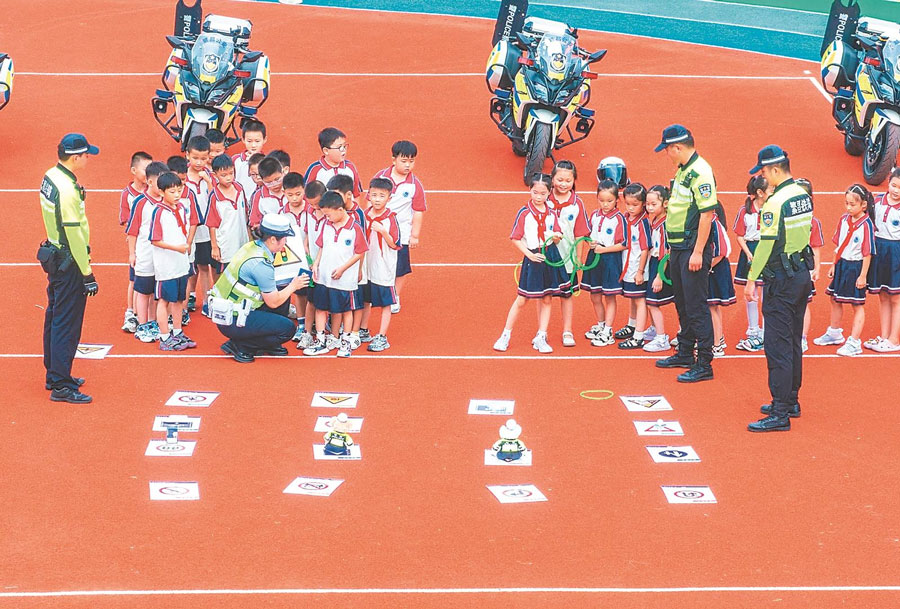 9月1日,在蕪湖市繁昌區繁陽鎮城關四小,交警組織學生通過“套圈識標志”游戲強化交通標識認知。通訊員 肖本祥 攝