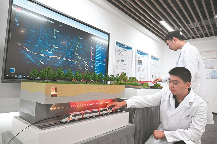 9月9日,研發人員黃興國(前)與王萌正在調試軌道交通安全光纖智能預警系統。