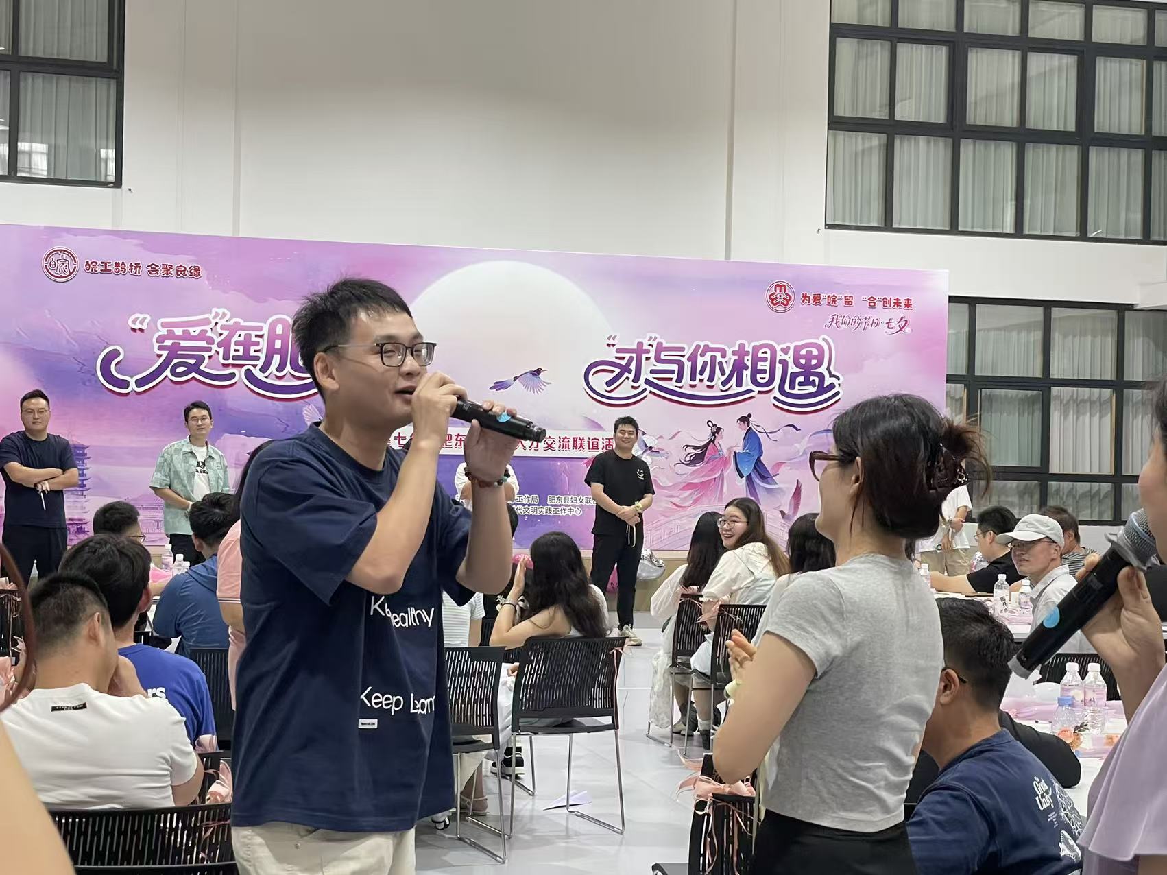 “主持人,我想要一首鄧紫棋的歌”,一名女嘉賓甜甜的聲音剛落,音樂響起,臺下的觀眾便自發跟唱;臺上男嘉賓接唱的張信哲《愛就一個字》,嗓音松弛溫柔,更引來了陣陣掌聲。活動現場,“鵲橋情歌”環節成了人氣焦點。14名來自縣公安局、肥東東城實驗小學等不同單位的青年登臺接歌,現場氛圍瞬間升溫。