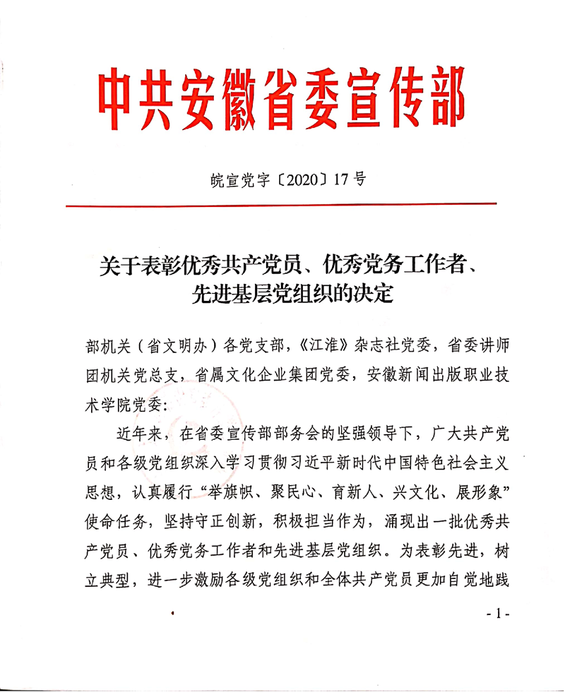 江淮雜志社強昌洋、冉然、劉利、陸迪四人表彰為優秀共產黨員,政治理論部黨支部表彰為先進基層黨組織。