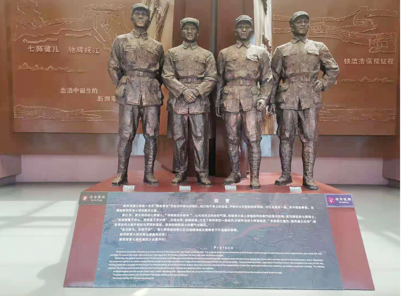 在新四軍第七師紀(jì)念館大廳前,首先映入眼簾的是新四軍第七師領(lǐng)導(dǎo)人張鼎丞、曾希圣、譚希林、傅秋濤的雕像,他們剛毅的面容透著頑強(qiáng)不屈的革命精神,黨員們懷著敬仰之情合影留念。隨后黨員們參觀了“牢記歷史勿忘國恥”“皖江抗日起怒潮”“血泊中誕生的新四軍”“信念如鐵蘊(yùn)清廉"等八大展廳,展廳里圖文并茂的宣傳欄、立體的戰(zhàn)斗和生產(chǎn)群像、櫥窗里的歷史物件、戰(zhàn)役中的文物等,仿佛讓人置身其中,回到了那艱苦崢嶸的歲月……當(dāng)年在皖南事變的血泊中浴火重生的新四軍七師,由小到大、由弱到強(qiáng),四年多時(shí)間里就建立了面積3萬多平方公里的皖江抗日根據(jù)地。輝煌的戰(zhàn)績、光輝的歷程!革命先輩們?yōu)榱俗杂蔀榱私夥艗侇^顱、灑熱血,出生入死、前赴后繼的革命斗爭精神,深深震撼著黨員們的心。